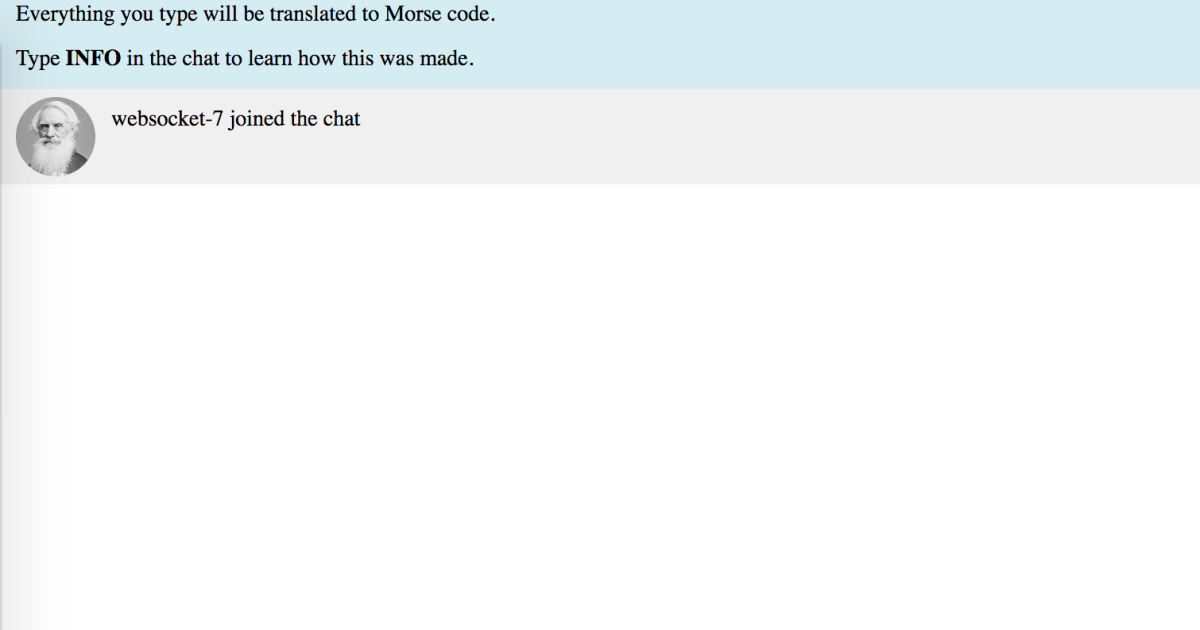 The Morse Chat Demo app has been released. This app demonstrates the use of WebSockets through simple chat functionality. The app lets you join a chat room, and all chat messages are translated to morse code server side.